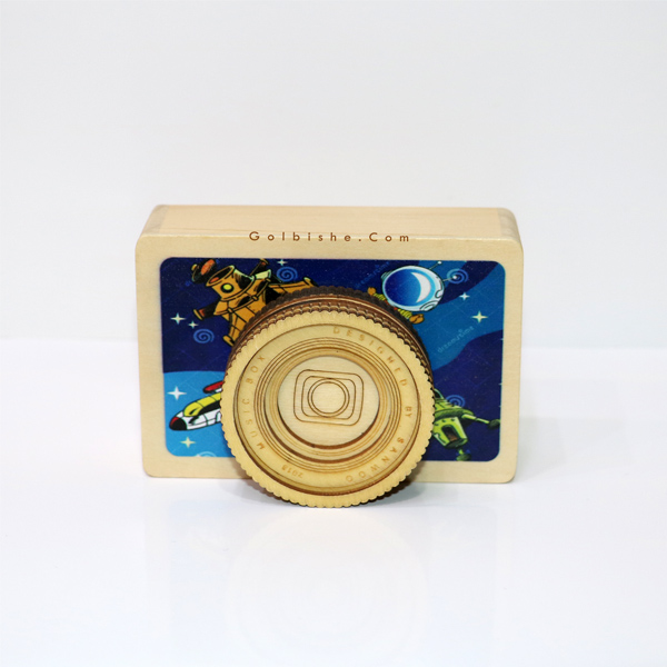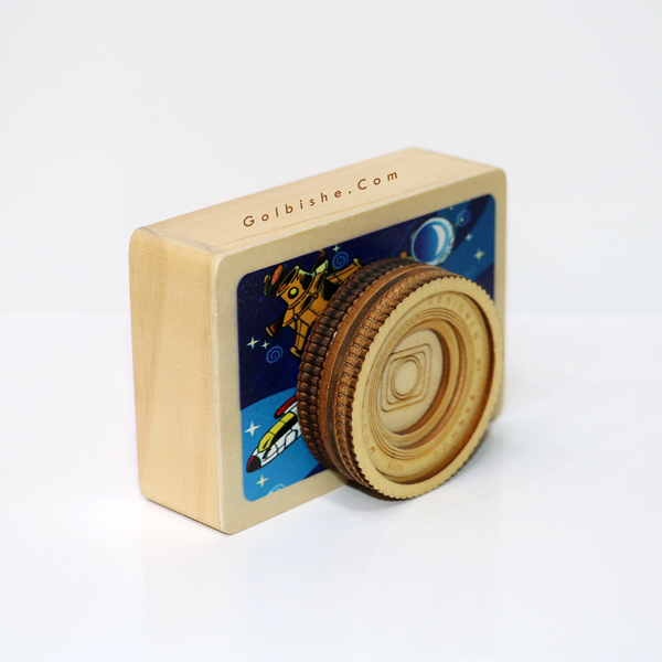 این جعبه موزیکال زیبا و خلاقانه با طراحی دوربین عکاسی، ترکیبی از هنر چوب‌بری و الهام از دنیای عکاسی است. بدنه‌ی اصلی این محصول از چوب طبیعی ساخته شده که نه تنها حس گرمی و لطافت چوب را به کاربر منتقل می‌کند، بلکه کیفیت و دوام بالای آن را نیز تضمین می‌کند. بخش جلویی دوربین با تصویر گرافیکی از یک ربات فضایی، سیاره‌ها و موشک تزئین شده که تداعی‌کننده دنیای خیال‌انگیز کودکان است. لنز دوربین از چندین قطعه چوبی با دقت بالا بریده شده و به صورت چرخ‌دنده‌ای روی هم قرار گرفته‌اند که نمایی سه‌بعدی و جذاب ایجاد کرده است. این لنز نمادین نه تنها جلوه‌ای زیباشناسانه به محصول می‌بخشد، بلکه با چرخاندن آن، مکانیزم موزیکال جعبه به کار می‌افتد و آهنگی لطیف و دلنشین پخش می‌شود.